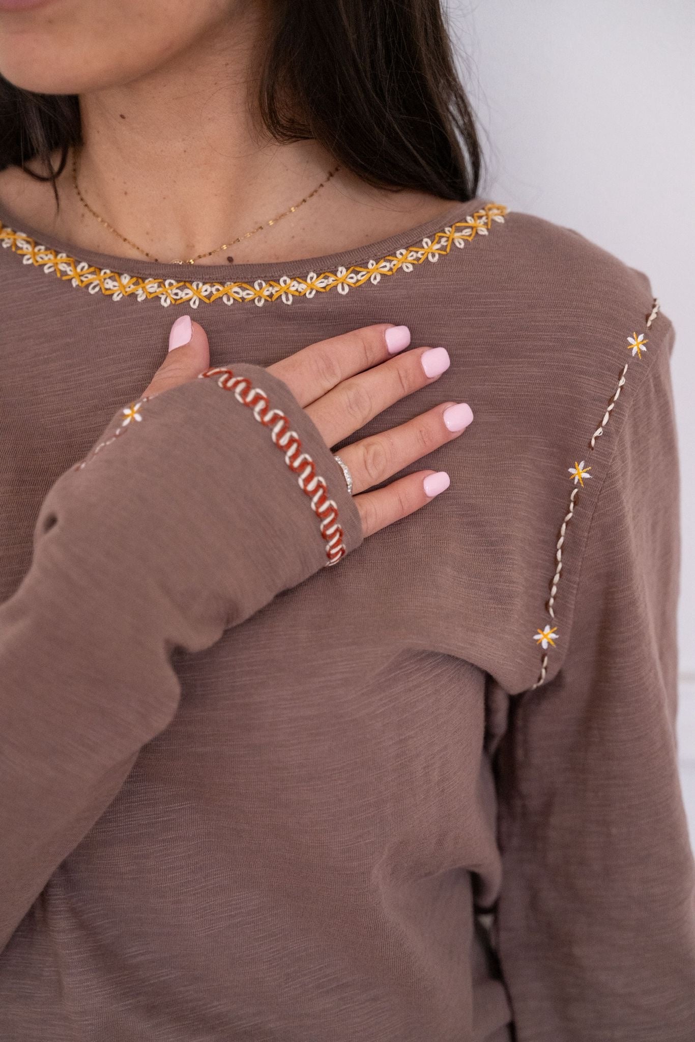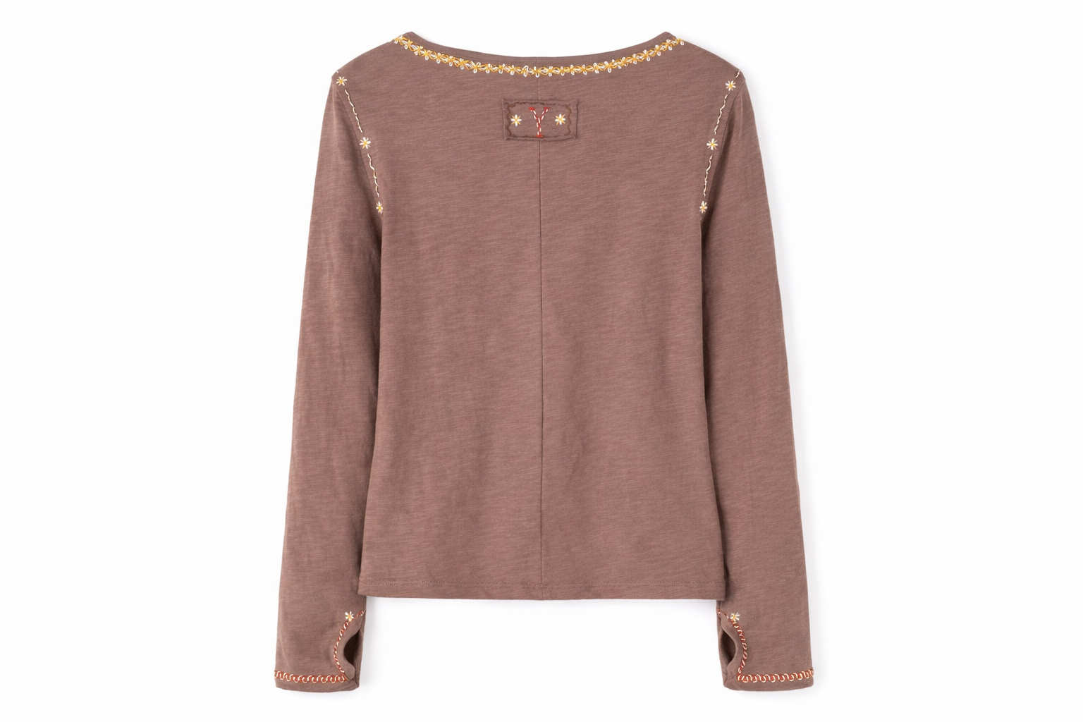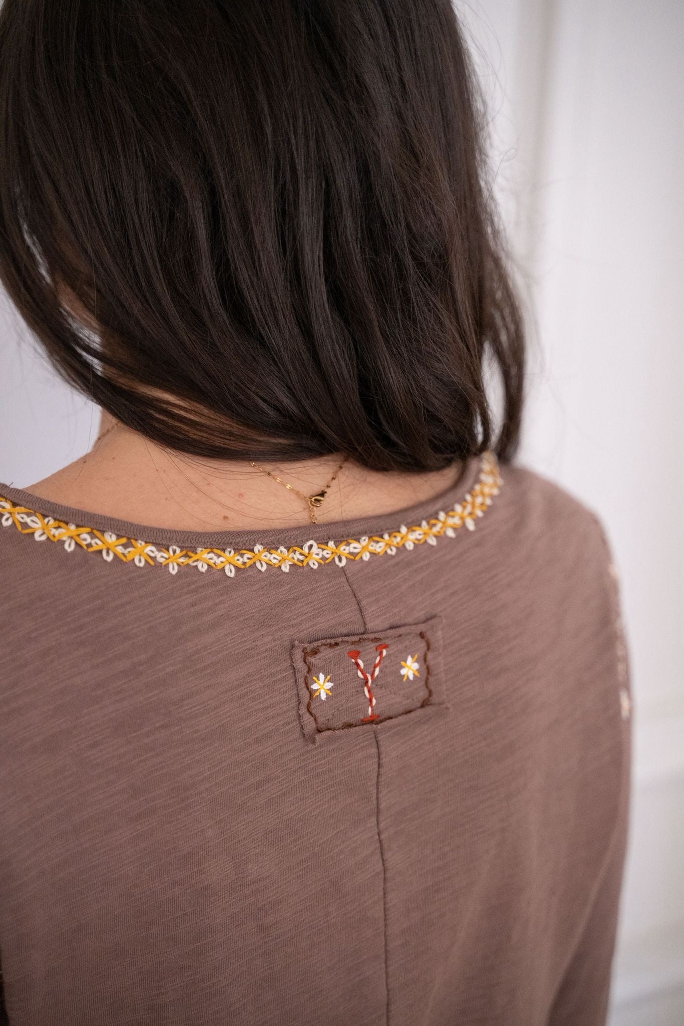 T-shirt manches longues en 100% coton, peint et brodé à la main à Paris. Son coloris taupe est sublimé par de délicates broderies florales à l’encolure et le long des manches. Chaque pièce est unique, reflet d’un savoir-faire artisanal. Coupe fluide et confortable, facile à porter au quotidien.