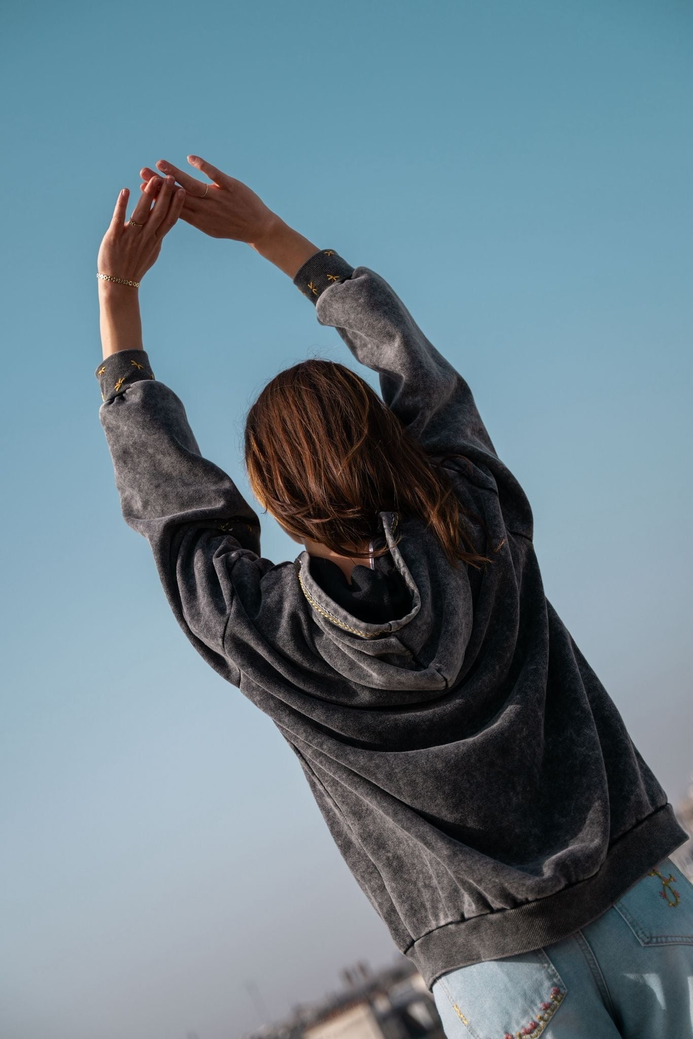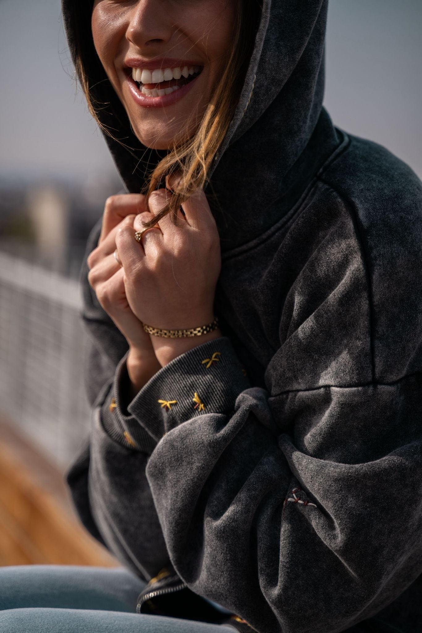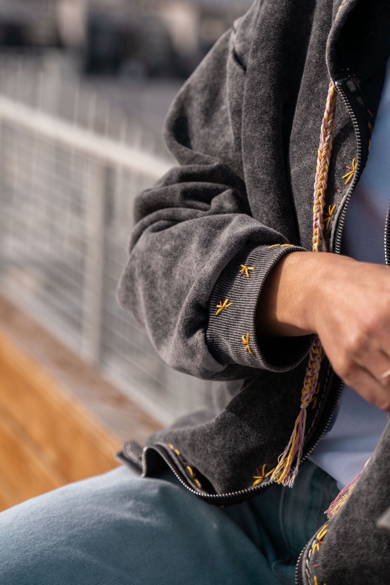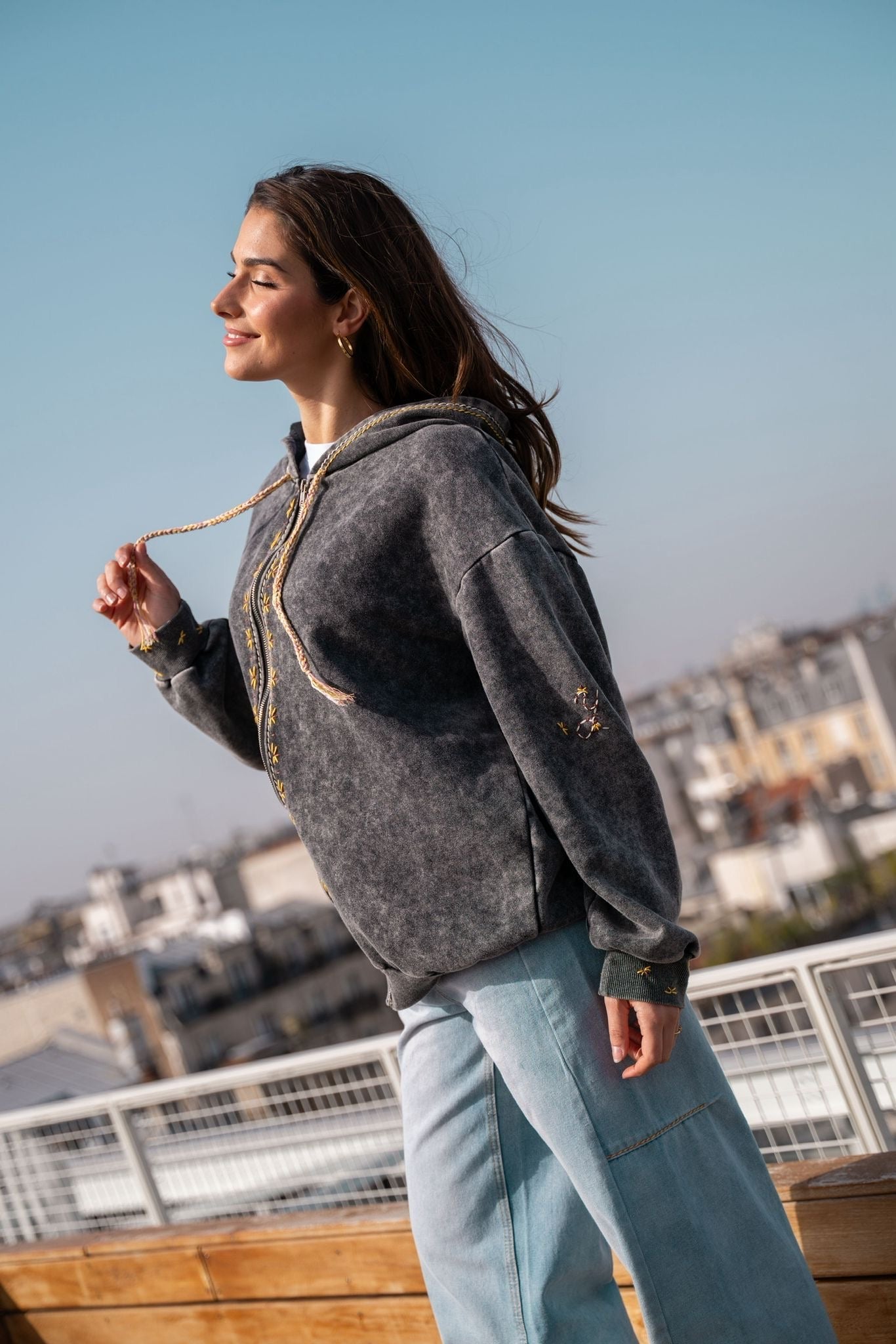 Sweat à capuche coupe décontractée, en coton doux effet délavé pour un style casual et confortable. Il est rehaussé de broderies artisanales colorées sur les manches, les poignets et le long de la fermeture, ainsi que de cordons tressés multicolores qui apportent une touche unique.
